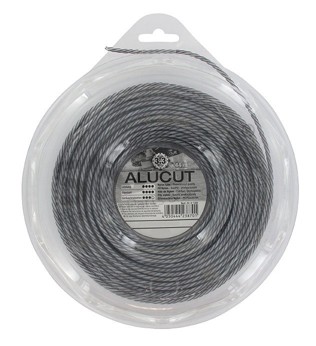 HYBRID-TWISTED ALUCUT - Vierkant gedraaid 3,3 mm x 44 m (donut) - zwart. Eigenschappen: bijzonder slag- en slijtvast, extreem slijtvast, speciale snijkantversterking, nyloncopolymeer met aluminiumdeeltjes. (Aluline, trimmerdraad, maaidraad, nylondraad).