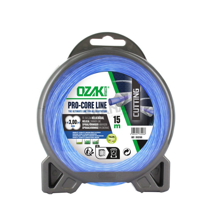 Blister nylon maaidraad premium Ozaki. Ge-coëxtrudeerde absorberende kern (flexibiliteit) en mantel met hoge slijtweerstand (duurzaamheid) met spiraalvormige vorm (geluidsvermindering). Lengte : 15 m, Ø: 3,00mm.