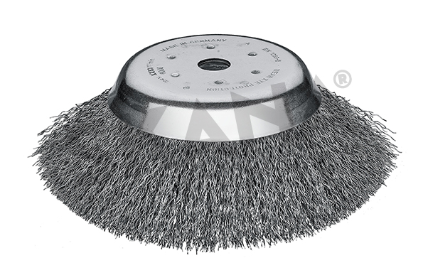 Conische borstelkop gecoate staaldraden voor bosmaaier van 1 pk (0,7 kW) tot max 2,5 pk (1,8 kW). Diameter: 180 mm, boring: 25,4 mm. Voor het reinigen van in elkaar grijpende straatstenen, betonnen stoepranden, enz. Speciaal gereedschap dat niet op volle snelheid moet worden gebruikt.