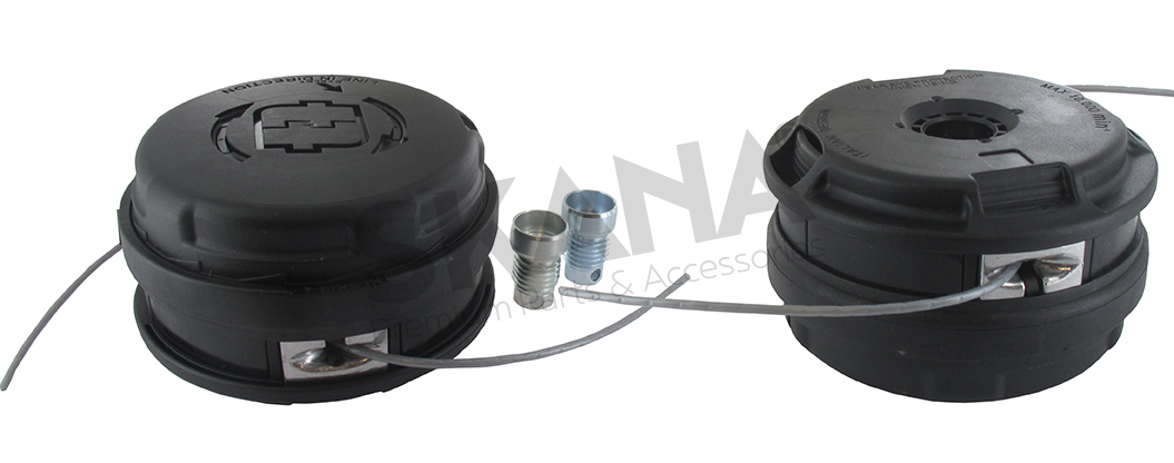 Universele EASY WORK TEC FEED nylon draadkop. Vervangt origineel ECHO-SHINDAIWA. Doorsnee 109 mm. Met laden met behulp van de pommel. Geleverd met twee M10 x 1 LHF-adapters; M12 x 1,5 LHF.