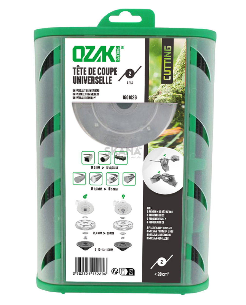 Universele nylon maaikop, uniek ontwerp, zeer eenvoudig draden invoeren ! Voor 2 stuks maaidraad. Bovendeel uit aluminium, onderste gedeelte uit hars. Geleverd inclusief 8 NYLSAW maaidraden. Voor machines vanaf 20 cc.