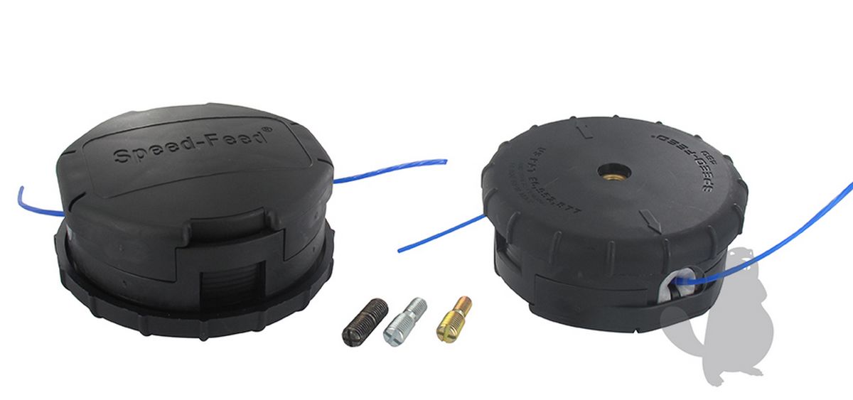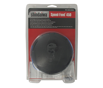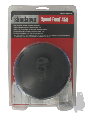 Draadkop Speed Feed 450 SHINDAIWA. voor trimmers met rechte arm en ruggedragen bosmaaiers. Geleverd met 3 adapters 7mm links/10mm links, 8mm links/10mm links en 10mm links/10mm links. voor nylon draden 2,0mm en 2,4mm. 6m reserve
