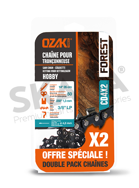 Blister met 2 afgelengde zaagkettingen OZAKI halfhaaks: 3/8"LP .050" (1,3mm) 50 aandrijfschakels ( E50 ).
