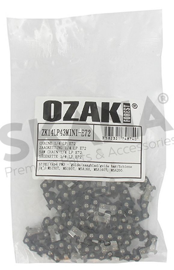 Zaagketting op maat OZAKI half haaks 1/4" .043 (1,1mm) mini 72 schakels. Geschikt voor modellen met 14" zaagbladen: MS150T, MS193T thermische kettingzagen, MSA160, MSA160T, MSA200 kettingzagen op batterijen.