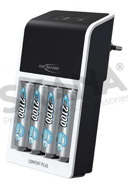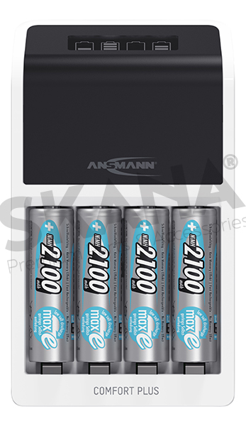 Comfort Plus snellader 230 V - 650 mA, 100% automatisch + 4 AA 2100 mAh oplaadbare batterijen. Voor het opladen van 1-4 NiMH-batterijen van Micro AAA / Mignon AA of 1-2 AAA/AA-batterijen of een 9V-batterij.