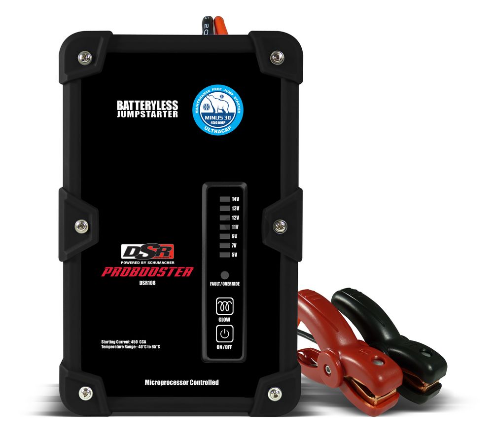 Supercondensatoren booster zonder batterij SCHUMACHER® voorzien van 12V en 450A via een 12V sigaretten aansteker kabel (meegeleverd) of Micro-USB-poort (niet meegeleverd). Geïntegreerde voltmeter duidt de spanning van de batterij van het voertuig aan en het laadniveau van de condensator. Compact ontwerp.