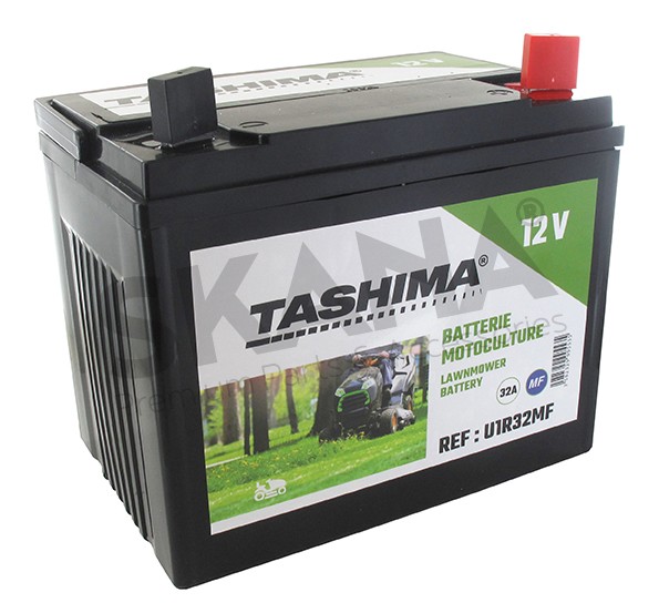 12V Batterij voor zitmaaiers, voorgeladen, onderhoudsvrij, 32A. L: 196, L: 131, H:184mm, + rechts. Vervangt origineel: U1R32.