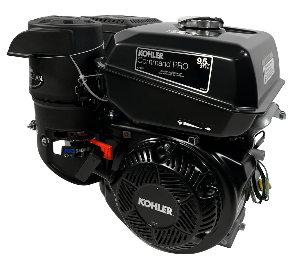 Originele KOHLER-motor, Command Pro-serie CH395-03226 OHV, 277 cc, nominaal vermogen 9,5 pk, netto koppel: 18,8 Nm bij 2500 tpm, krukas: horizontaal - cilindrisch - Ø 25,4 mm, lengte: 70 mm (schroefdraad 3/8"-UNF-24, spiebaan: 6,3 mm), met handstarter, brandstoftank (7,3 l), uitlaatdemper en oliepeilwaarschuwingseenheid.
